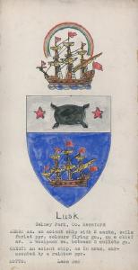 “Piper (Ashen co. Essex; granted 23 July, 1723 to John Piper, Esq., of Ashen, son of John Piper, or Cornard Magna, and grandson of John Piper, also of Cornard Magna, co. Suffolk, and to the descendants of his said grandfather; Mary Piper, the heiress, m. Henry Sperling, Esq., of Dynes Hall, co. Essex). Gu. A chev. embattled ar. betw. two falcons belled in chief or, and a dexter gauntlet in base barwise, holding a sword erect all ppr. Crest – A demi griffin reguard. ppr. Supporting an antique shield charged with a gauntlet and sword, as in the arms.”
