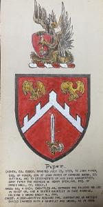 “Piper (Ashen co. Essex; granted 23 July, 1723 to John Piper, Esq., of Ashen, son of John Piper, or Cornard Magna, and grandson of John Piper, also of Cornard Magna, co. Suffolk, and to the descendants of his said grandfather; Mary Piper, the heiress, m. Henry Sperling, Esq., of Dynes Hall, co. Essex). Gu. A chev. embattled ar. betw. two falcons belled in chief or, and a dexter gauntlet in base barwise, holding a sword erect all ppr. Crest – A demi griffin reguard. ppr. Supporting an antique shield charged with a gauntlet and sword, as in the arms.”